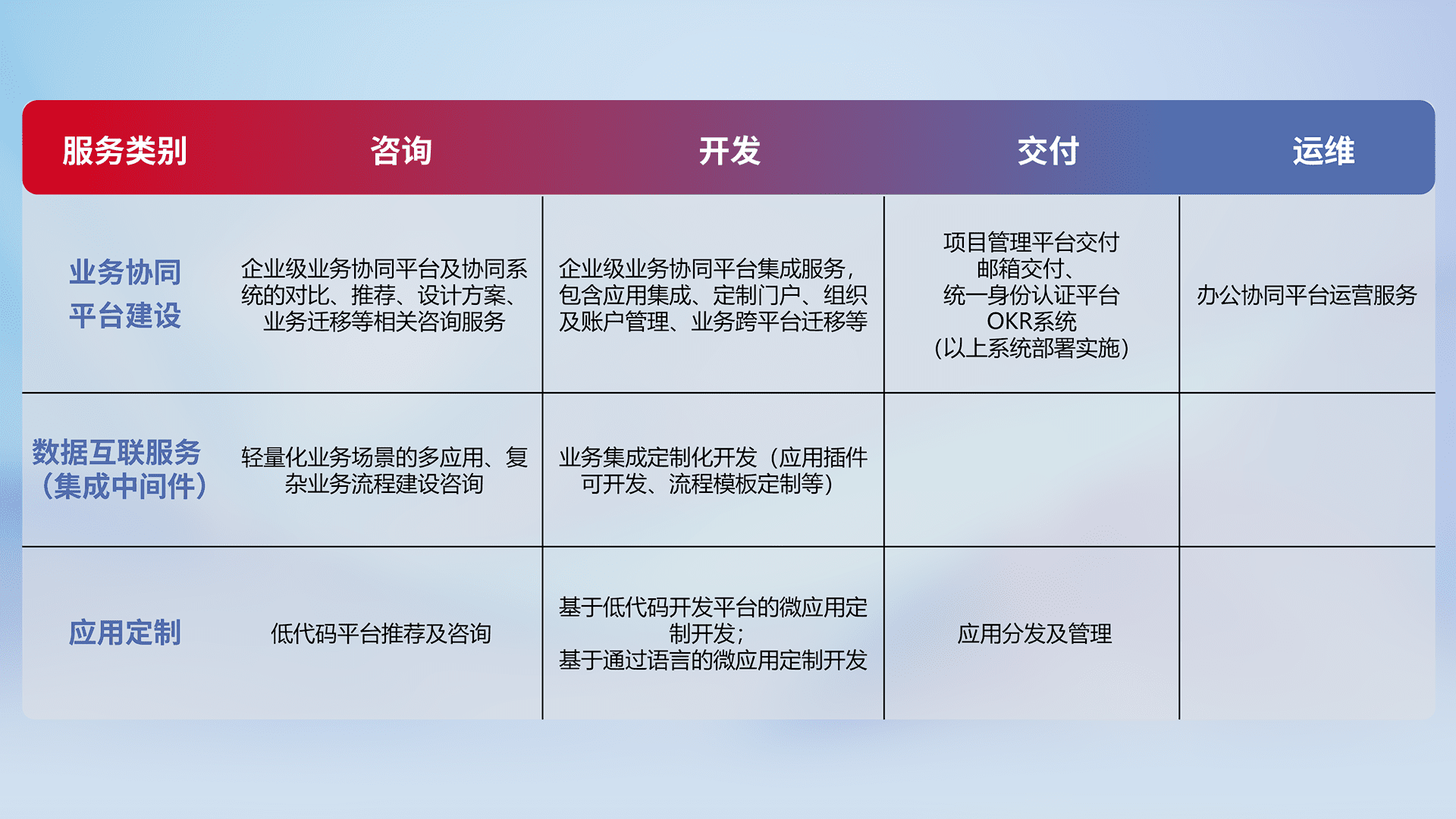 针对钉钉、、、企微、、、、IDaas等平台级产品提供产品的规划、、、、方案、、、、交付、、、、定制化开发等服务,,,实现如统一协同办公、、、、智能客户服务、、、、混合会议管理、、智能数据查询、、等业务场景,,,实现数字化转型。。。。